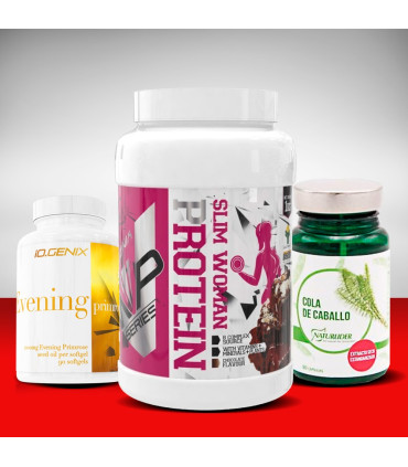 Os traemos un pack especialmente pensando para el cuidado vuestra alimentación. Con la proteína de alta calidad de iO Genix, la Slim Woman protein, con una fórmula especial para vosotras, la cola de caballo de Naturlider, que mejorará la eliminación de líquidos y el aceite de Onagra, Evening Primrose de Io Genix, que regulará muchas de vuestras funciones metabólicas, estamos seguros que unido al cuidado de vuestra alimentación y el ejercicio que realizáis, tendréis unos resultados estupendos, de forma rápida y sobre todo duradera! ...no dejéis de probar este pack, con la ventaja de un precio mejor y con el servicio que siempre damos... en 24h en vuestra casa!