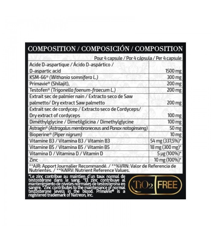 Ingredientes: ácido D-aspártico, agentes de recubrimiento (sulfitos) (gelatina y colorantes (carbonato cálcico y octenil succinato sódico de almidón)), KSM-66® (extracto seco de ashwagandha (Withania somnifera L)), Primavie® (Shilajit), Testofen® (Trigonella foenum-fraecum L), extacto seco de Saw palmetto (Serenoa repens, 25% ácidos grasos), extracto seco de crdycep (Cordyceps sinensis), dimetilglicina, Astragin® (extracto seco de astragalus (Astragalus menbranaceus Moench.) y extracto seco de ginseng (Panax notoginseng)), picolinato de zinc, Bioperine® (extracto seco de pimienta negra (Piper nigrum)), vitamina D (colecalciferol), VItamina B5 (pantotenato de calcio), Vitamina B3 (nicotinamida) y antiaglomerante (estearato de magnesio).