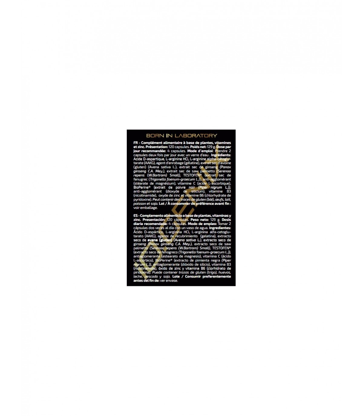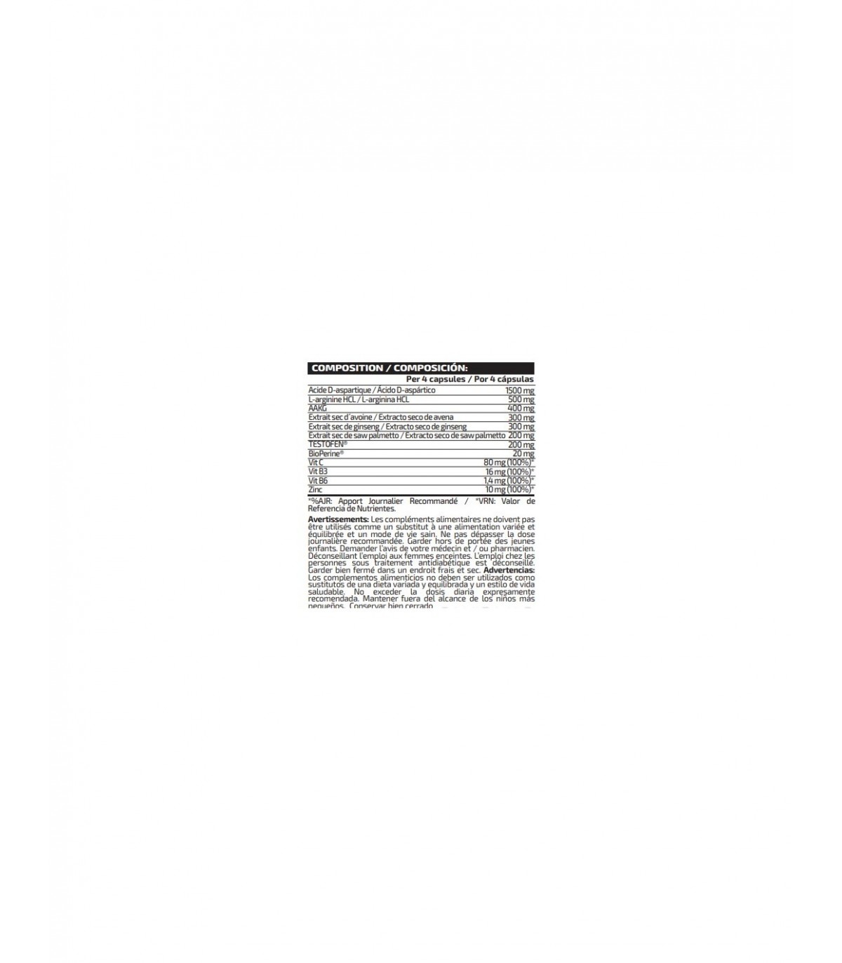 Ingredientes: Ácido D-aspártico, L-arginina HCl, L-arginina alfa-cetoglu - tarato (AAKG), agente de recubrimiento (gelatina), extracto seco de avena (gluten) (Avena sativa L.), extracto seco de ginseng (Panax ginseng C.A. Mey.), extracto seco de saw palmetto (Serenoa repens (W.Bartram) Small), TESTOFEN® (extracto seco de fenogreco (Trigonella foenum-graecum L.)), antiaglomerante (estearato de magnesio), vitamina C (ácido L-ascórbico), BioPerine® (extracto de pimienta negra (Piper nigrum L.)), antiaglomerante (dióxido de silicio), vitamina B3 (nicotinamida), óxido de zinc y vitamina B6 (clorhidrato de piridoxina). Puede contener trazas de gluten (trigo), huevos, leche, pescado y soja. Lote / Consumir preferentemente antes del fin de: ver envase.