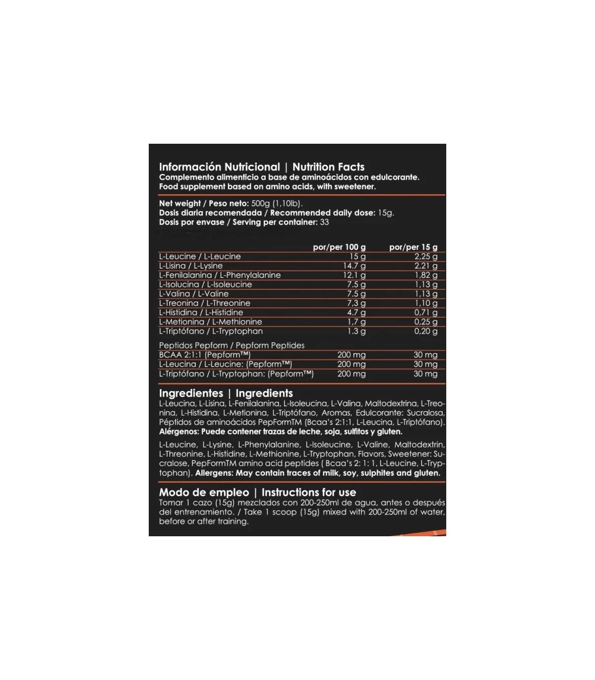 Leucina, Isoleucina, Valina, dextrosa anhidra, maltodextrina, clorhidrato de Lisina, Fenilalina, Treonina, Histidina, Metionina, Triptófano, edulcorante (sucralosa E955), peptidos de aminoácidos Pep Form ( bcaa,s 2.1.1, Leucina y triptófano).