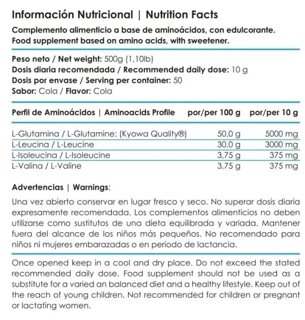 L-Glutamina (KIOWA), Leucina, isoleucina, valina, dextrosa, regulador del amargor, aroma melocotón o naranja, ácido citrico, edulcorante (sucralosa)