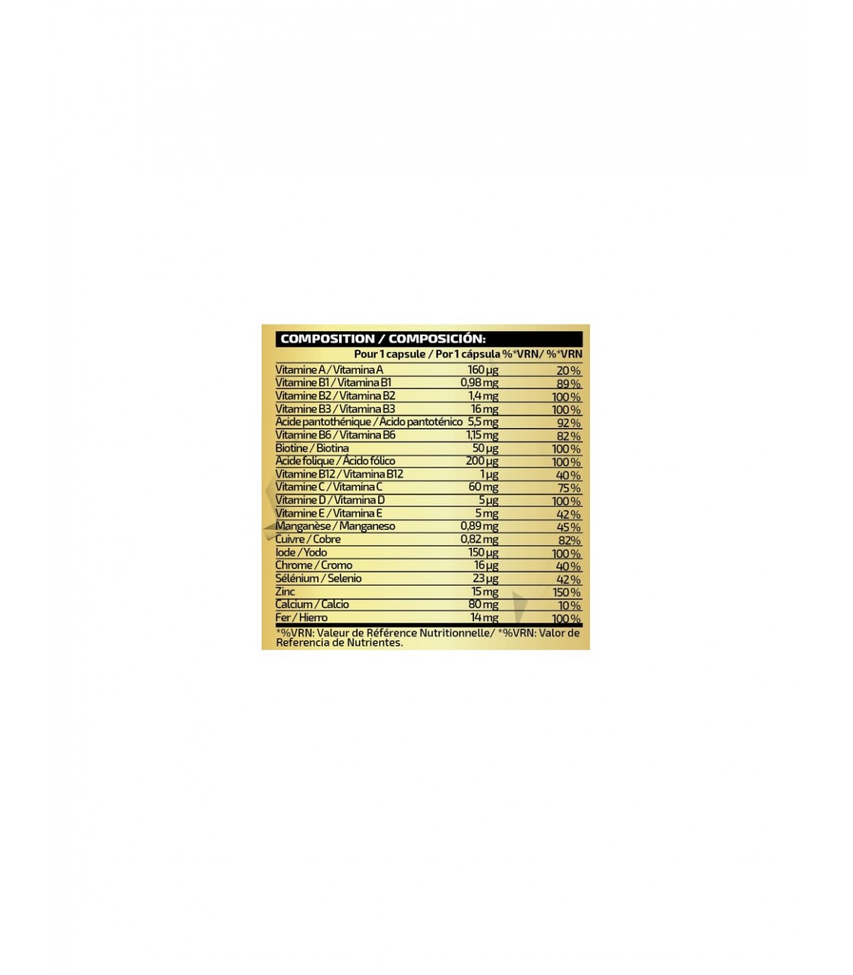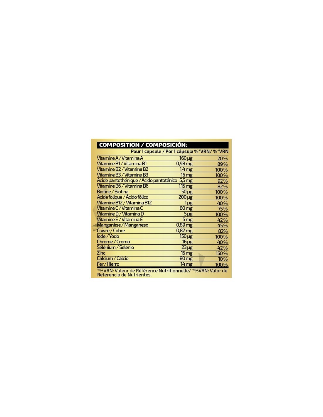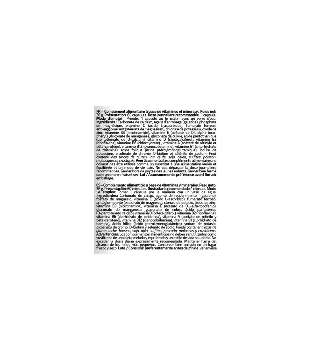 Ingredientes: Carbonato de calcio, agente de recubrimiento (gelatina), fosfato de magnesio, vitamina C (ácido L-ascórbico), fumarato ferroso, antiaglomerante (estearato de magnesio), cloruro de potasio, óxido de zinc, vitamina B3 (nicotinamida), vitamina E (acetato de D,L-alfa-tocoferilo), gluconato de manganeso, gluconato de cobre, ácido pantoténico (D-pantotenato cálcico), vitamina D (colecalciferol), vitamina B2 (riboflavina), vitamina B6 (clorhidrato de piridoxina), vitamina A (acetato de retinilo y beta-caroteno), vitamina B12 (cianocobalamina), vitamina B1 (clorhidrato de tiamina), ácido fólico (ácido pteroilmonoglutámico), yoduro de potasio, picolinato de cromo, D-biotina y selenito de sodio. Puede contener trazas de gluten, leche, huevos, soja, apio, sulfitos, pescado, moluscos y crustáceos.