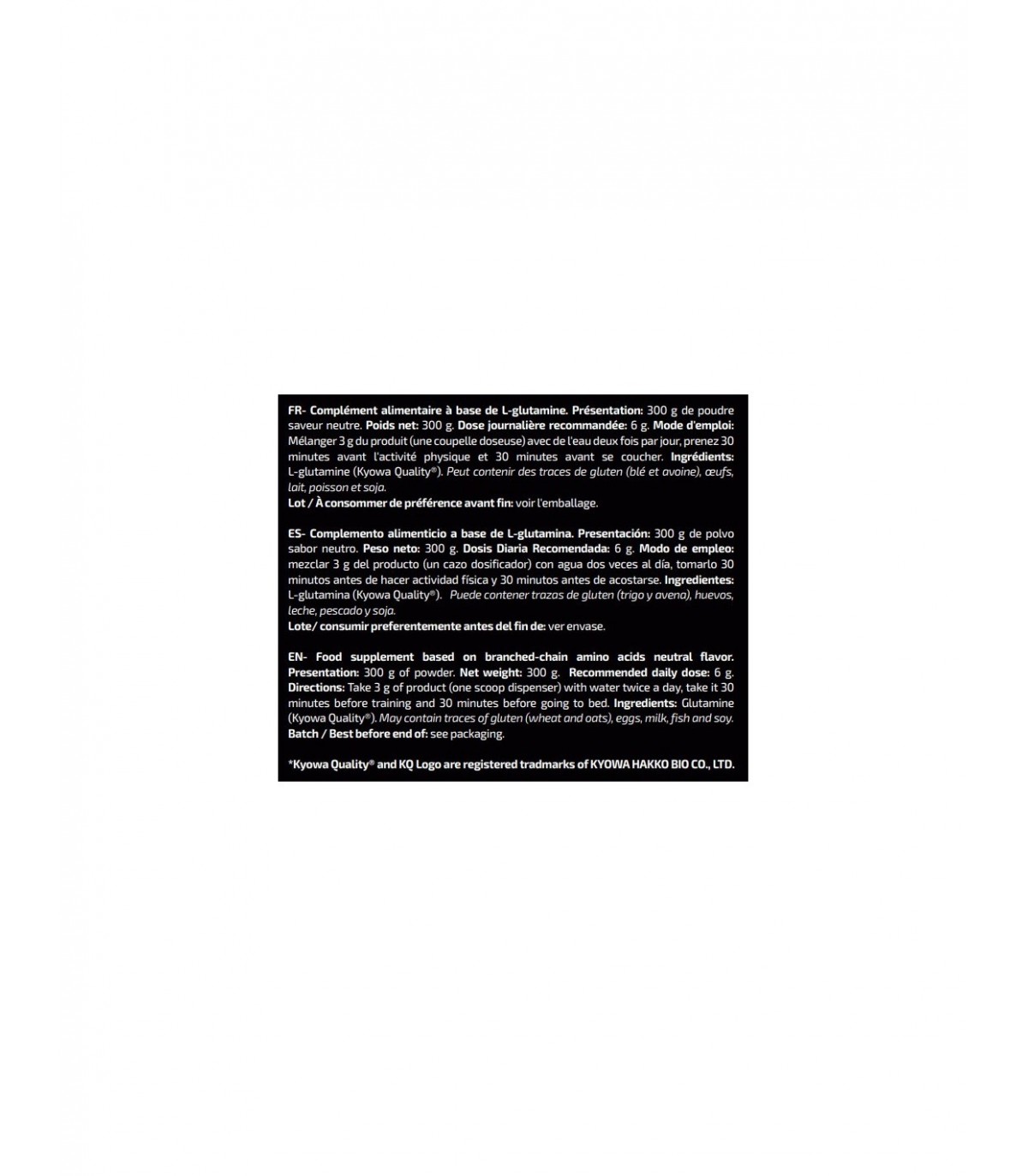 Ingredientes: L-glutamina Kyowa Quality®, maltodextrina, acidulante (ácido cítrico), aroma, edulcorantes (sucralosa y acesulfamo K) y vitamina B6 (clorhidrato de piridoxina). Puede contener trazas de gluten (trigo y avena), huevos, leche, pescado y soja.