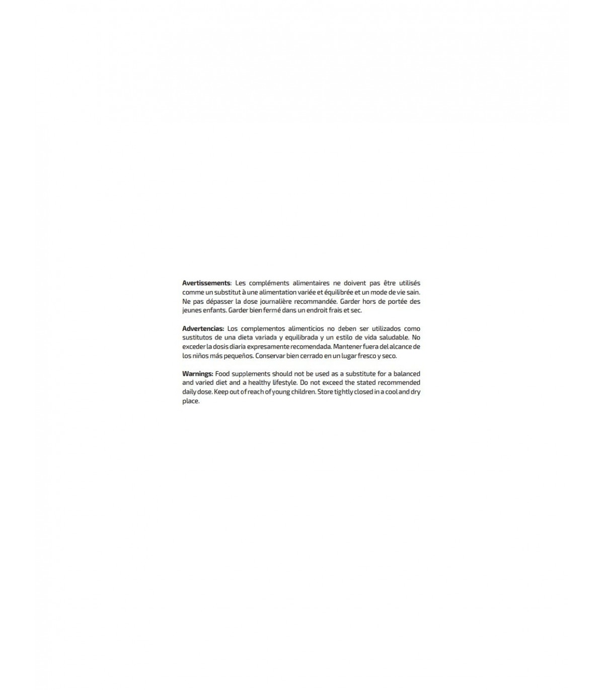 Advertencias: Los complementos alimenticios no deben ser utilizados como sustitutos de una dieta variada y equilibrada y un estilo de vida saludable. No exceder la dosis diaria expresamente recomendada. Mantener fuera del alcance de los niños más pequeños. Conservar bien cerrado en un lugar fresco y seco.