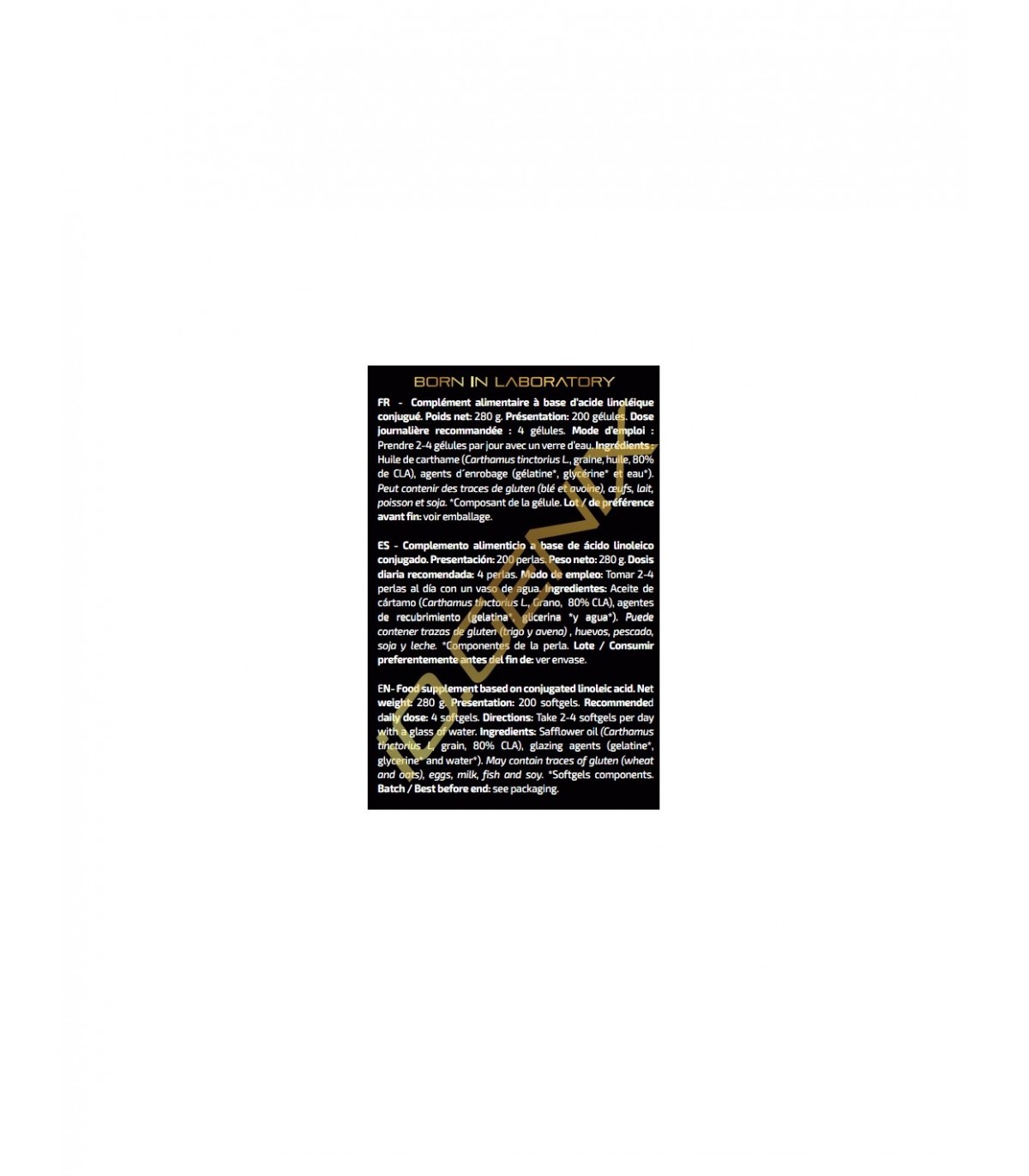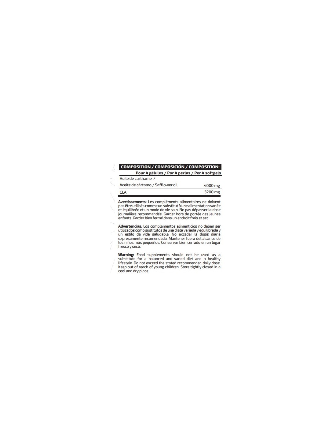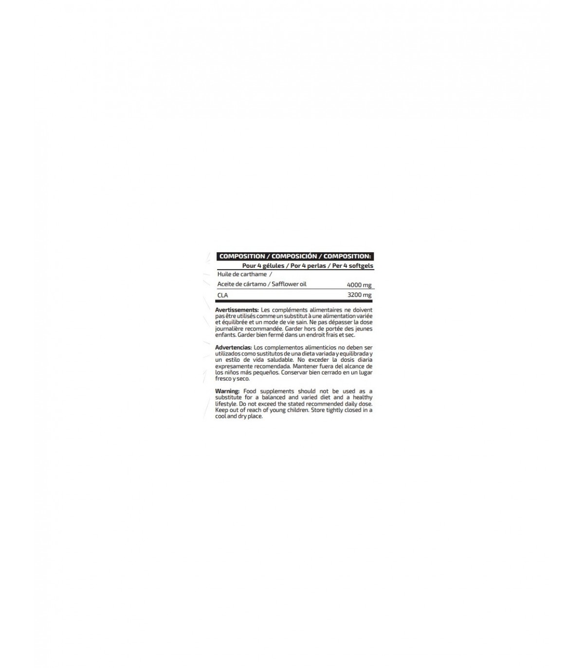 Ingredientes: Aceite de cártamo (Carthamus tinctorius L., grano, 80% CLA), agentes de recubrimiento (gelatina*, glicerina *y agua*). Puede contener trazas de gluten (trigo y avena), huevos, leche, pescado y soja.