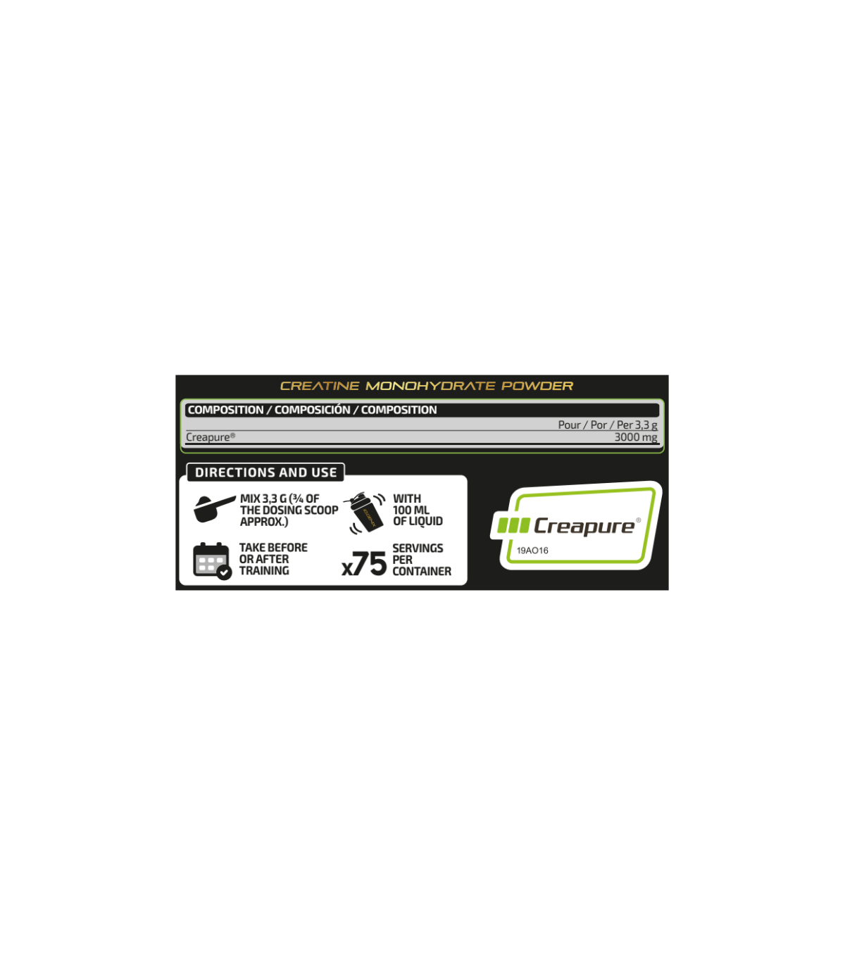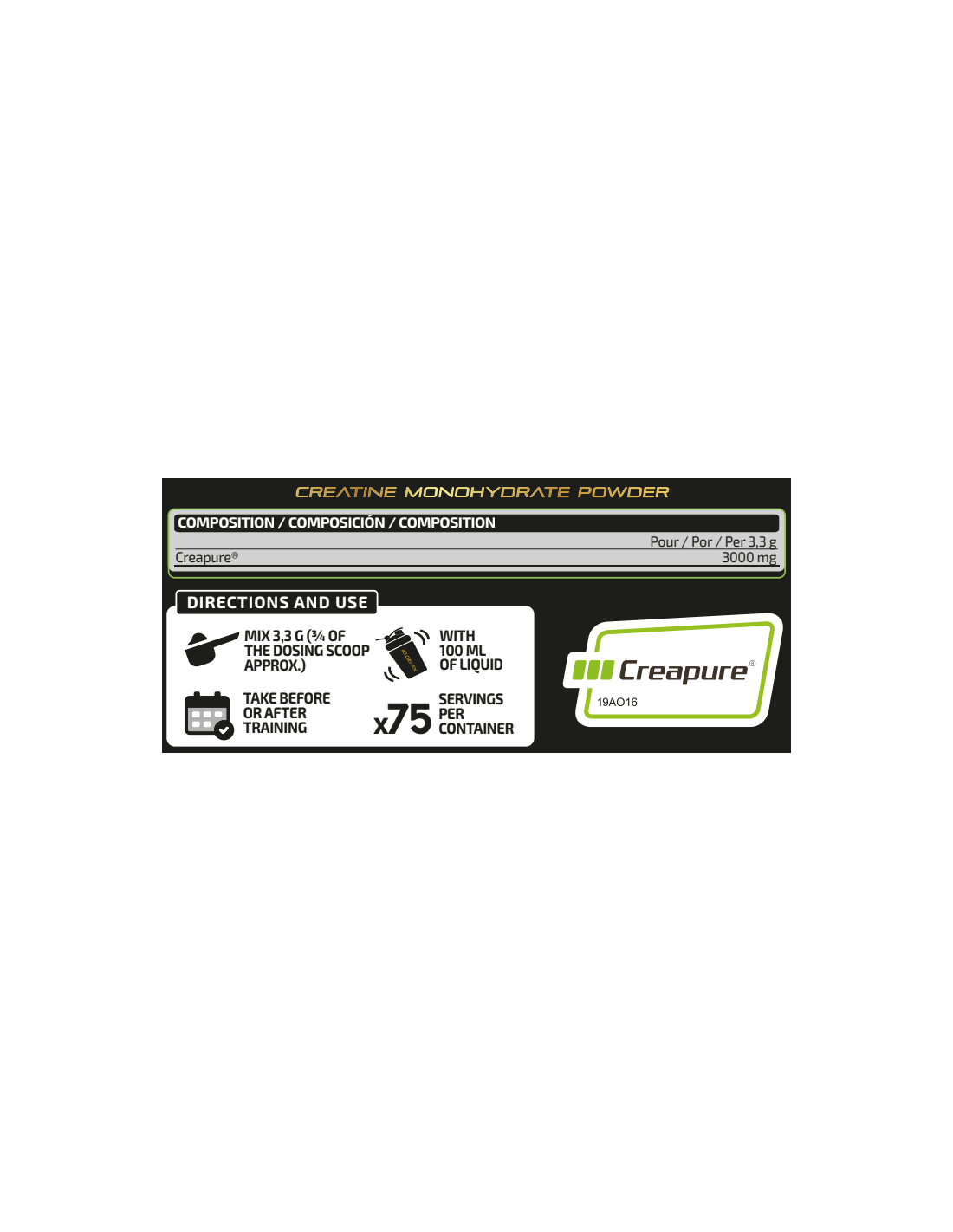 Complemento alimenticio a base de creatina monohidrato. Presentación: 250 g de polvo sabor neutro. Peso neto: 250 g. Dosis diaria recomendada: 3 g. Modo de empleo: Mezclar 3 g (3⁄4 del cacito dosificador aprox.) del producto preferiblemente con una bebida rica en hidratos de carbono con 100 ml de líquido y tomar antes o después del entrenamiento. Ingredientes: Creapure® (100% creatina monohidrato). Puede contener trazas de frutos de cáscara, cacahuete, huevos, leche, pescado y soja. Lote / Consumir preferentemente antes del fin de: ver envase. Advertencias: Los complementos alimenticios no deben utilizarse como sustitutos de una dieta equilibrada. Es importante seguir una dieta variada y equilibrada y un estilo de vida saludable. No superar la dosis diaria expresamente recomendada. Mantener fuera del alcance de los niños más pequeños. Conservar bien cerrado en un lugar fresco y seco. La creatina mejora el rendimiento físico en series sucesivas de ejercicios breves de alta intensidad, este beneficio se obtiene con la ingesta diaria de 3 g de creatina.