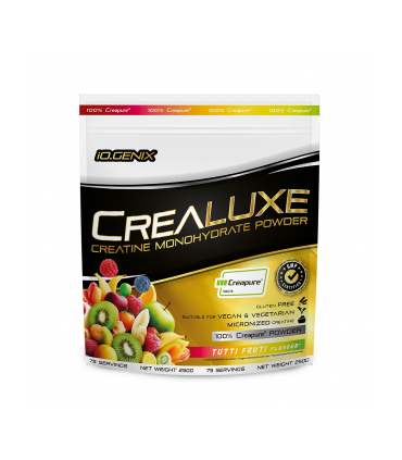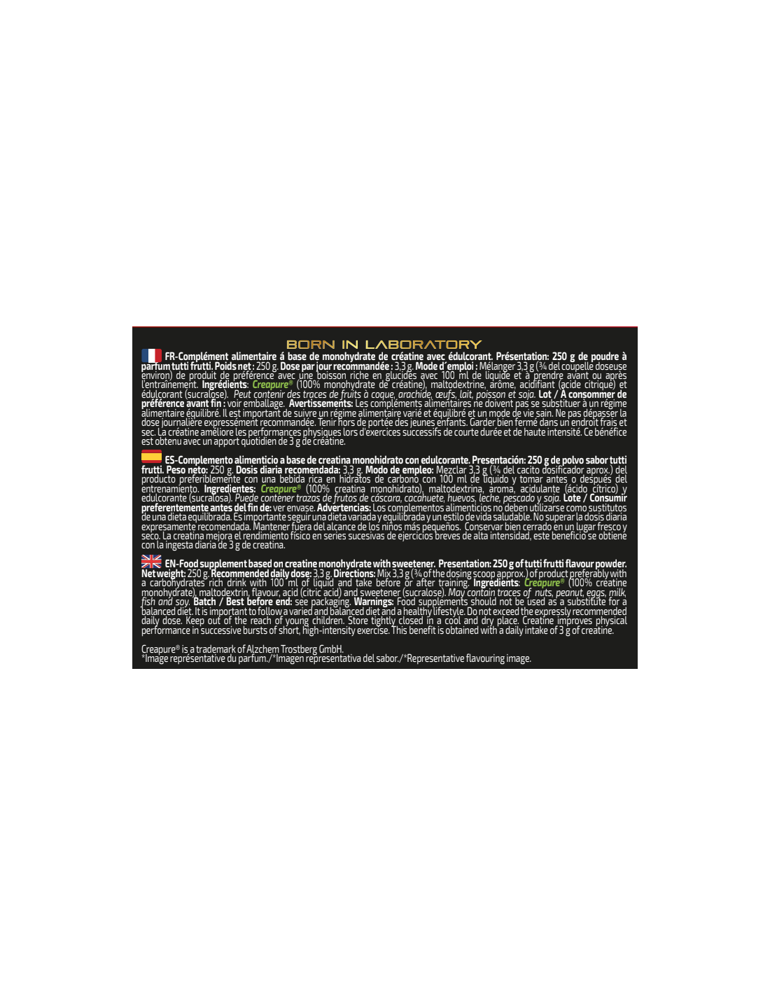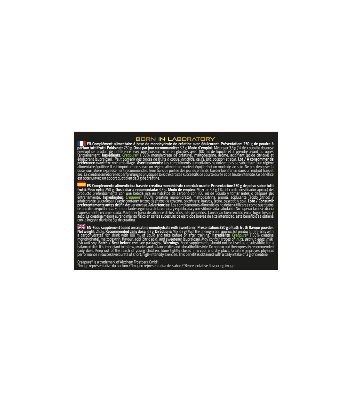 Complemento alimenticio a base de creatina monohidrato con edulcorante. Presentación: 250 g de polvo sabor tutti frutti. Peso neto: 250 g. Dosis diaria recomendada: 3,3 g. Modo de empleo: Mezclar 3,3 g (3⁄4 del cacito dosificador aprox.) del producto preferiblemente con una bebida rica en hidratos de carbono con 100 ml de líquido y tomar antes o después del entrenamiento. Ingredientes: Creapure® (100% creatina monohidrato), maltodextrina, aroma, acidulante (ácido cítrico) y edulcorante (sucralosa). Puede contener trazas de frutos de cáscara, cacahuete, huevos, leche, pescado y soja. Lote / Consumir preferentemente antes del fin de: ver envase. Advertencias: Los complementos alimenticios no deben utilizarse como sustitutos de una dieta equilibrada. Es importante seguir una dieta variada y equilibrada y un estilo de vida saludable. No superar la dosis diaria expresamente recomendada. Mantener fuera del alcance de los niños más pequeños. Conservar bien cerrado en un lugar fresco y seco. La creatina mejora el rendimiento