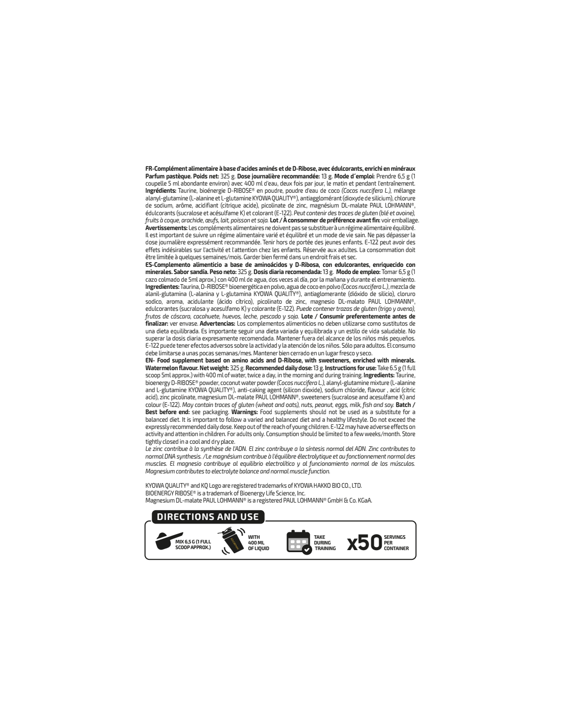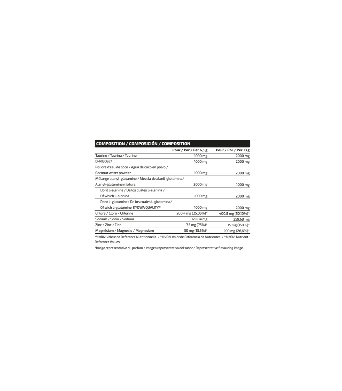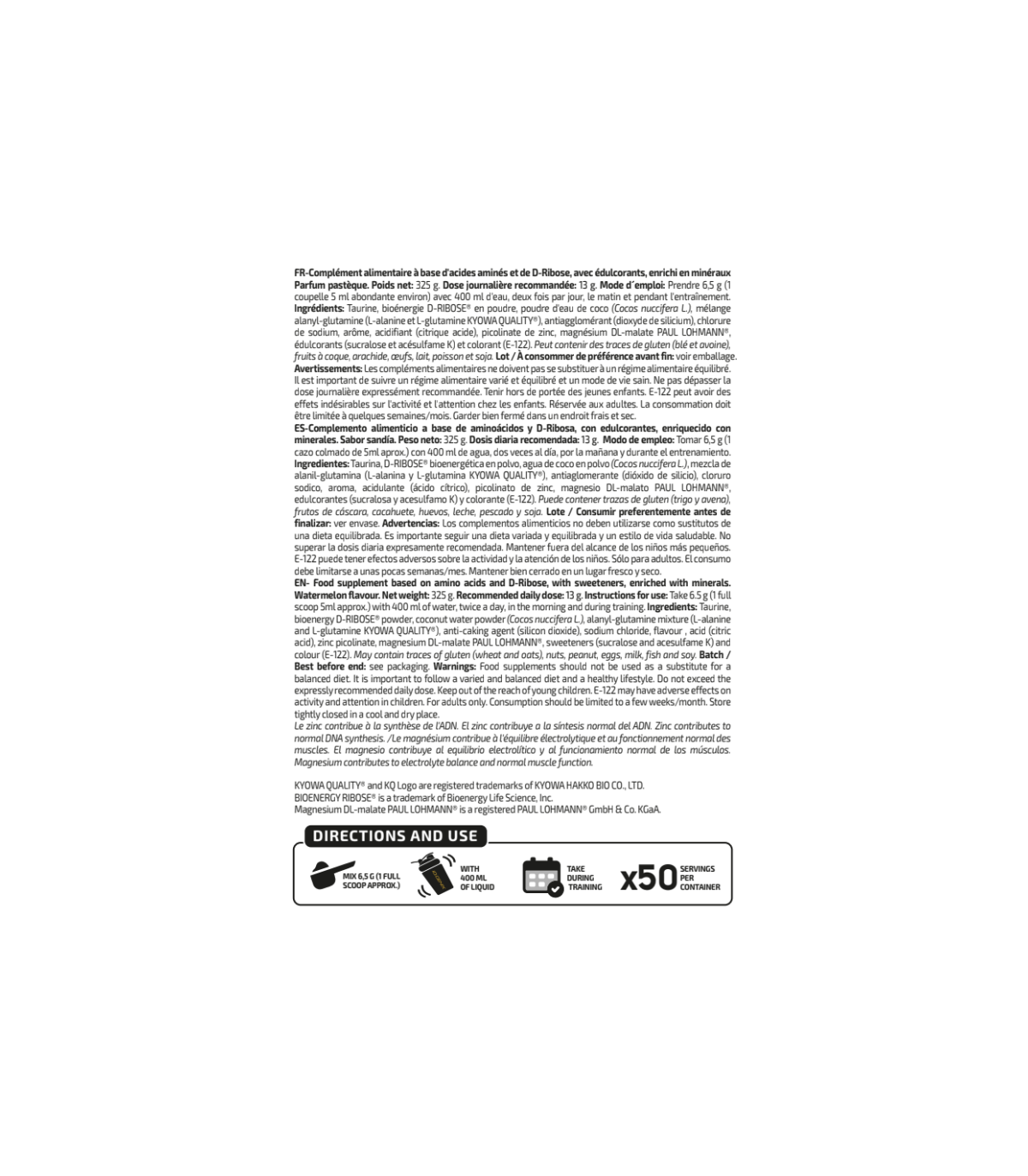 Complemento alimenticio a base de aminoácidos y D-Ribosa, con edulcorantes, enriquecido con minerales. Sabor sandía. Peso neto: 325 g. Dosis diaria recomendada: 13 g. Modo de empleo: Tomar 6,5 g (1 cazo colmado de 5ml aprox.) con 400 ml de agua, dos veces al día, por la mañana y durante el entrenamiento. Ingredientes: Taurina, D-RIBOSE® bioenergética en polvo, agua de coco en polvo (Cocos nuccifera L.), mezcla de alanil-glutamina (L-alanina y L-glutamina KYOWA QUALITY®), antiaglomerante (dióxido de silicio), cloruro sodico, aroma, acidulante (ácido cítrico), picolinato de zinc, magnesio DL-malato DR. PAUL LOHMANN®, edulcorantes (sucralosa y acesulfamo K) y colorante (E-122). Puede contener trazas de gluten (trigo y avena), frutos de cáscara, cacahuete, huevos, leche, pescado y soja. Lote / Consumir preferentemente antes de finalizar: ver envase. Advertencias: Los complementos alimenticios no deben utilizarse como sustitutos de una dieta equilibrada. Es importante seguir una dieta variada y equilibrada y un estilo de vida saludable. No superar la dosis diaria expresamente recomendada. Mantener fuera del alcance de los niños más pequeños. E-122 puede tener efectos adversos sobre la actividad y la atención de los niños. Solo para adultos. El consumo debe limitarse a unas pocas semanas/mes. Mantener bien cerrado en un lugar fresco y seco.