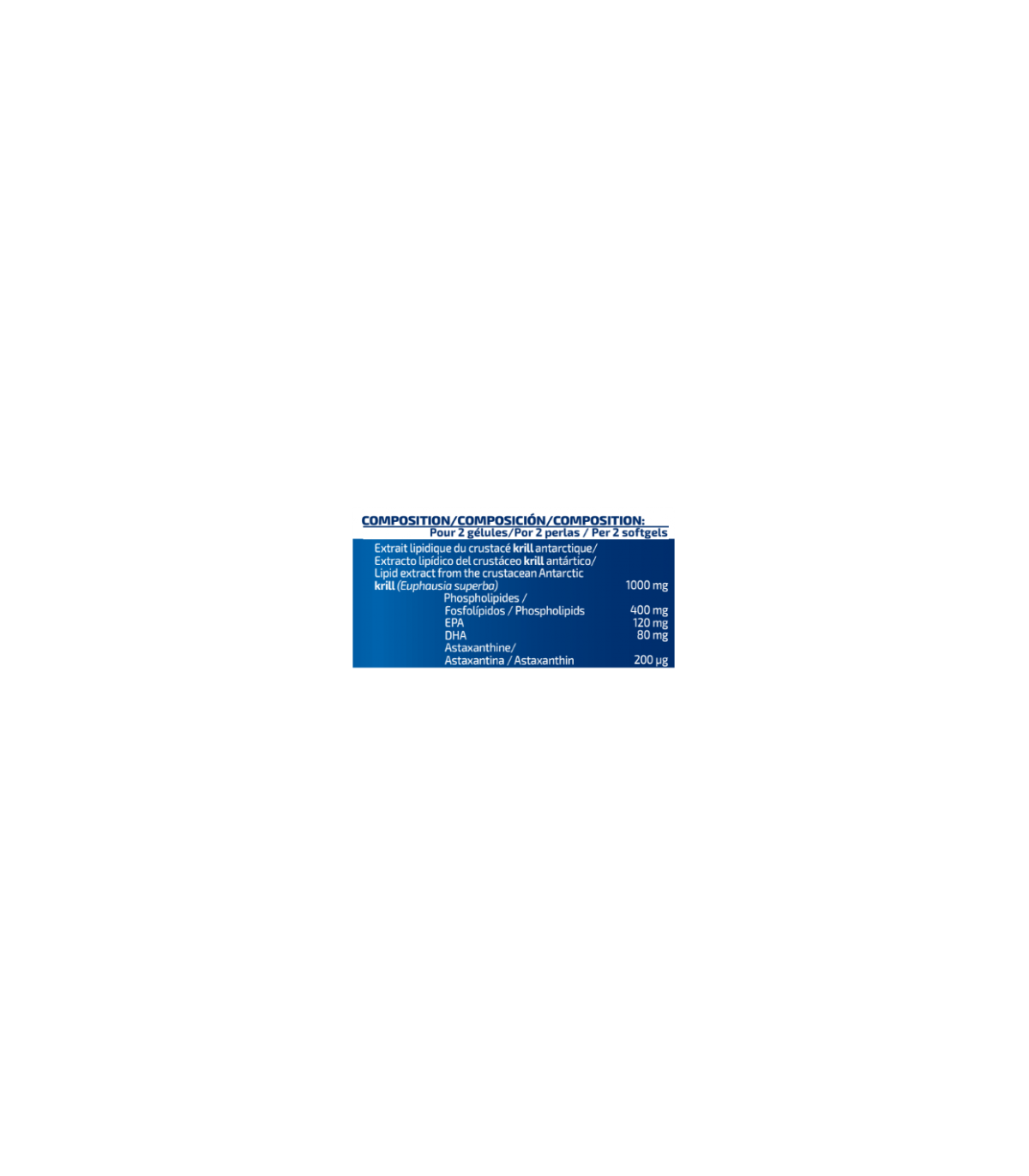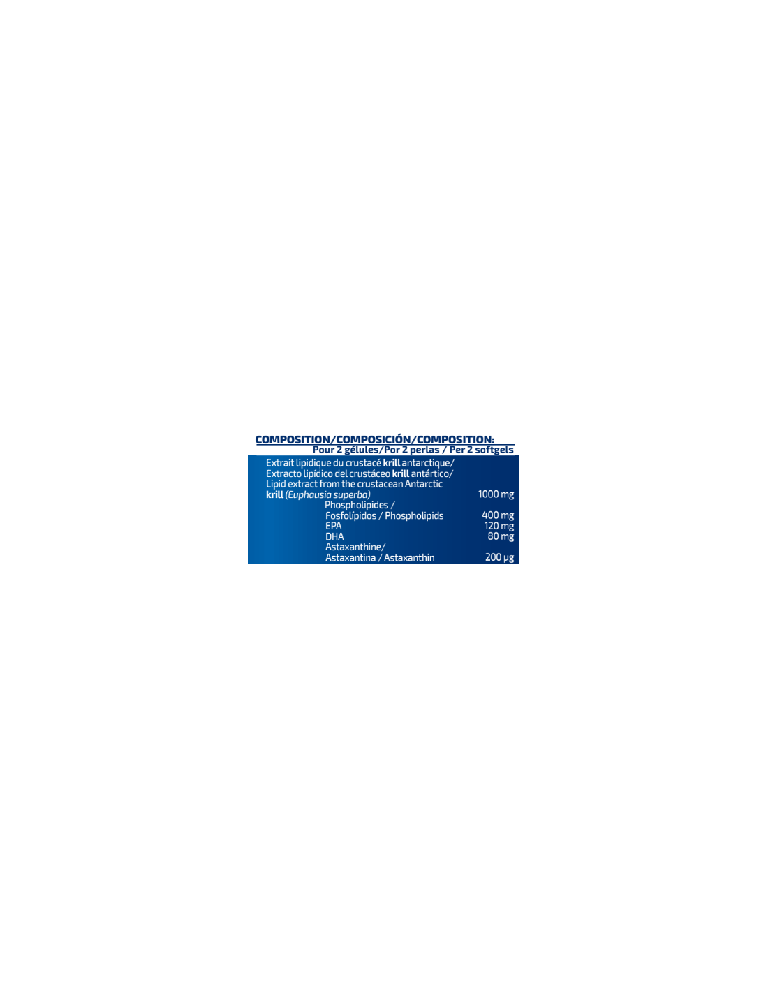Composición Por 2 perlas Extracto lipídico del crustáceo krill antártico 1000 mg Fosfolípidos 400 mg EPA 120 mg DHA 80 mg Astaxantina 200 µg