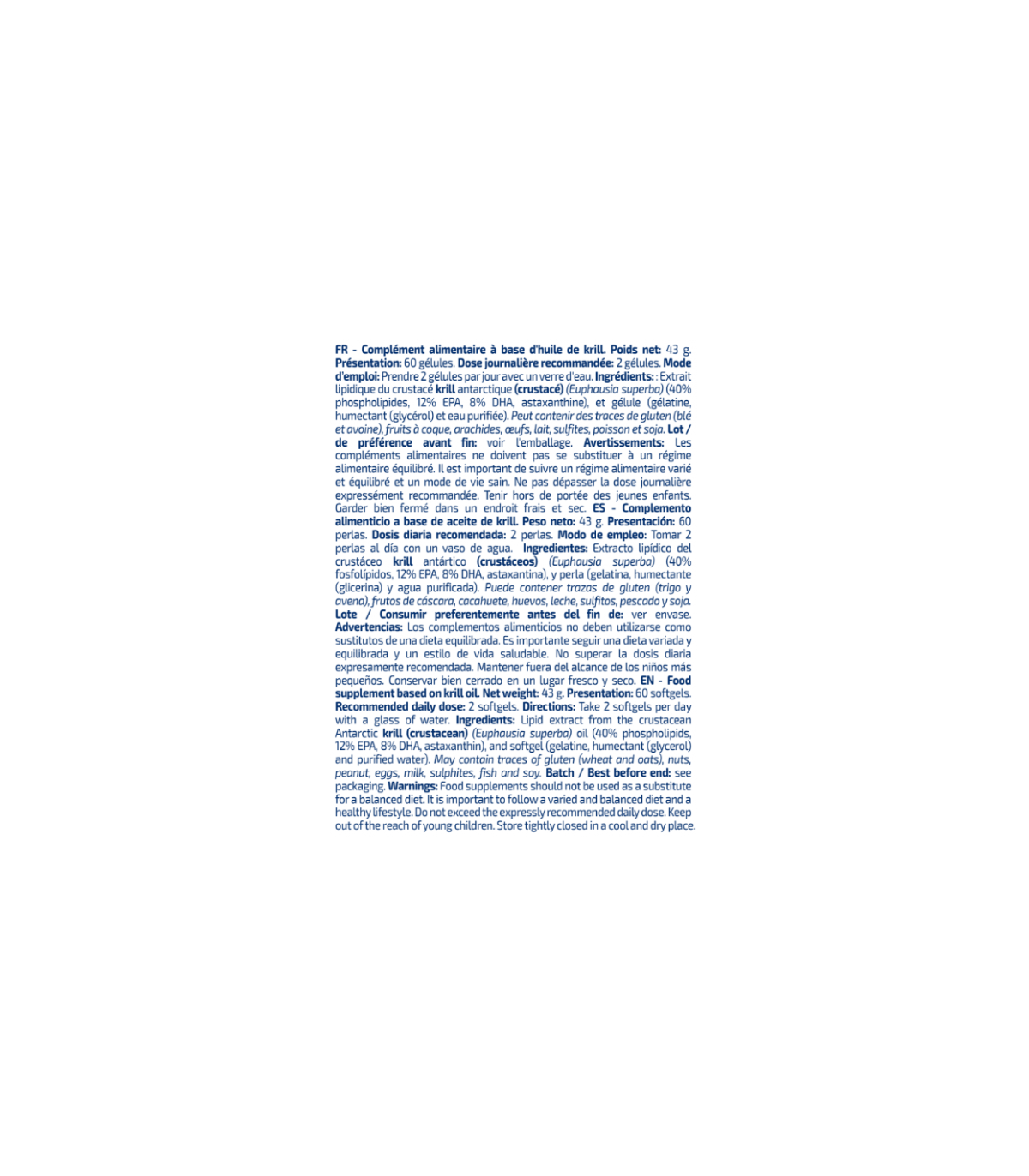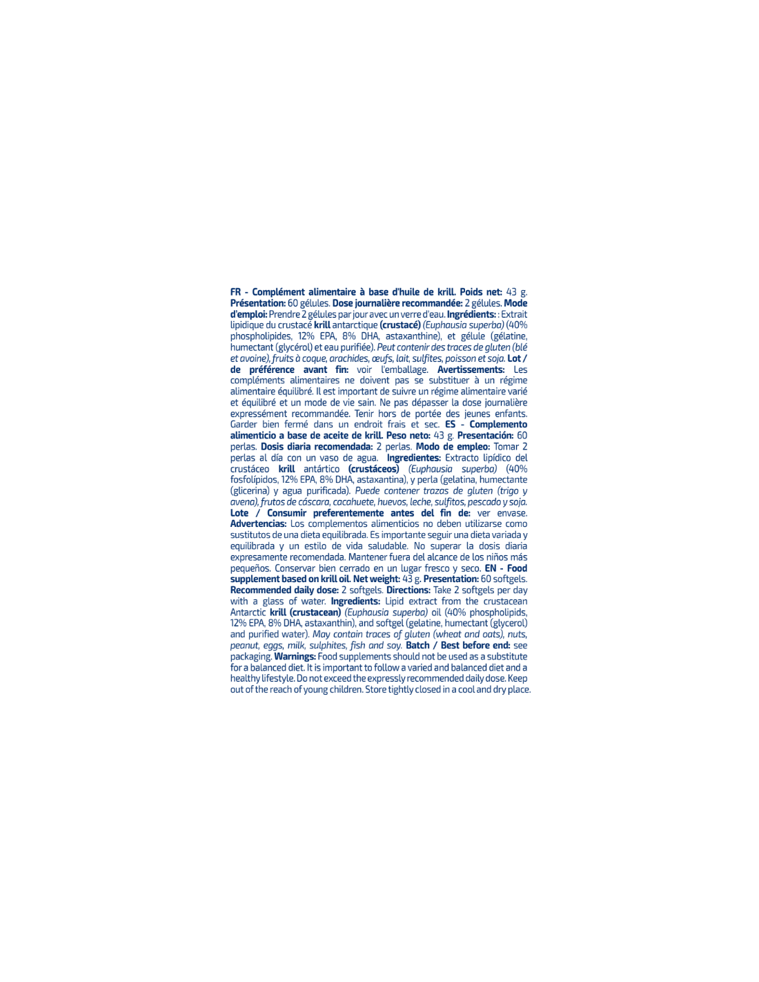 Complemento alimenticio a base de aceite de krill. Peso neto: 43 g. Presentación: 60 perlas. Dosis diaria recomendada: 2 perlas. Modo de empleo: Tomar 2 perlas al día con un vaso de agua. Ingredientes: Extracto lipídico del crustáceo krill antártico (crustáceos) (Euphausia superba) (40% fosfolípidos, 12% EPA, 8% DHA, astaxantina), y perla (gelatina, humectante (glicerina) y agua purificada). Puede contener trazas de gluten (trigo y avena), frutos de cáscara, cacahuete, huevos, leche, sulfitos, pescado y soja. Lote / Consumir preferentemente antes del fin de: ver envase. Advertencias: Los complementos alimenticios no deben utilizarse como sustitutos de una dieta equilibrada. Es importante seguir una dieta variada y equilibrada y un estilo de vida saludable. No superar la dosis diaria expresamente recomendada. Mantener fuera del alcance de los niños más pequeños. Conservar bien cerrado en un lugar fresco y seco.