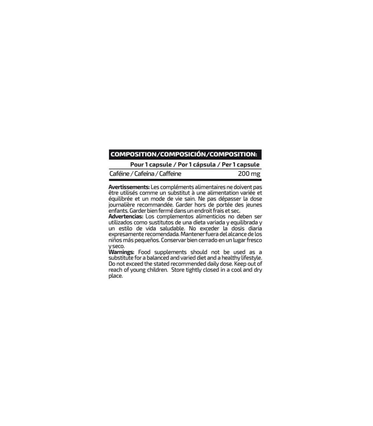 Complemento alimenticio a base de cafeína. Peso neto: 38 g. Presentación: 100 cápsulas. Dosis diaria recomendada: 1 cápsula. Modo de empleo: Tomar 1 cápsula al día con un vaso de agua. Ingredientes: Cafeína anhidra, cápsula (gelatina), agente de carga (carbonato de magnesio) y antiaglomerante (sales magnésicas de ácidos grasos). Contiene cafeína (200 mg por dosis diaria recomendada). No recomendado para niños ni mujeres embarazadas. Puede contener trazas de gluten (trigo y avena), frutos de cáscara, cacahuete, leche, huevos, soja, sulfitos y pescado. Lote / Consumir preferentemente antes del fin de: ver envase. Advertencias: Los complementos alimenticios no deben ser utilizados como sustitutos de una dieta variada y equilibrada y un estilo de vida saludable. No exceder la dosis diaria expresamente recomendada. Mantener fuera del alcance de los niños más pequeños.