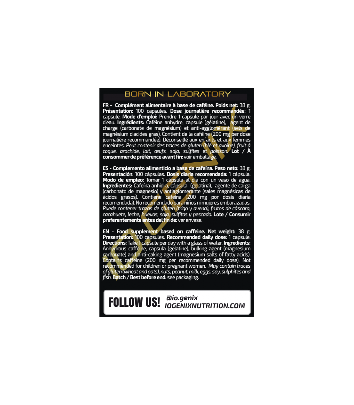 Desde iO.GENIX, han elaborado un complemento alimenticio únicamente de cafeína, para facilitar la ingesta de este estimulante de forma rápida y efectiva.