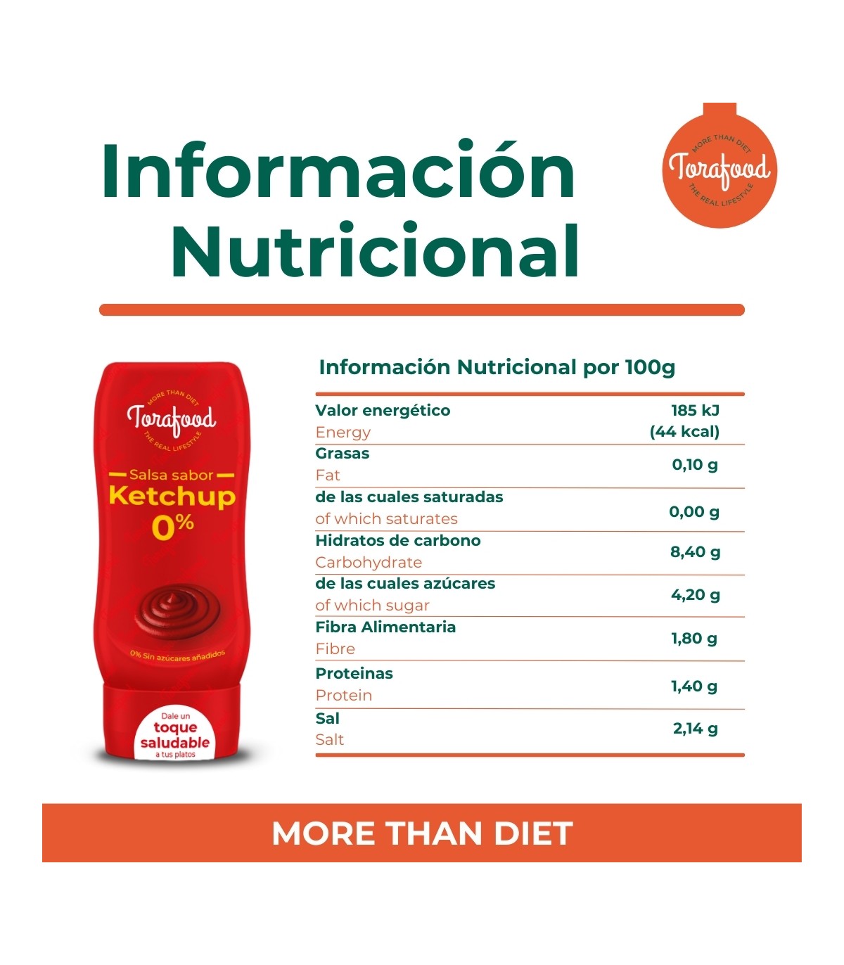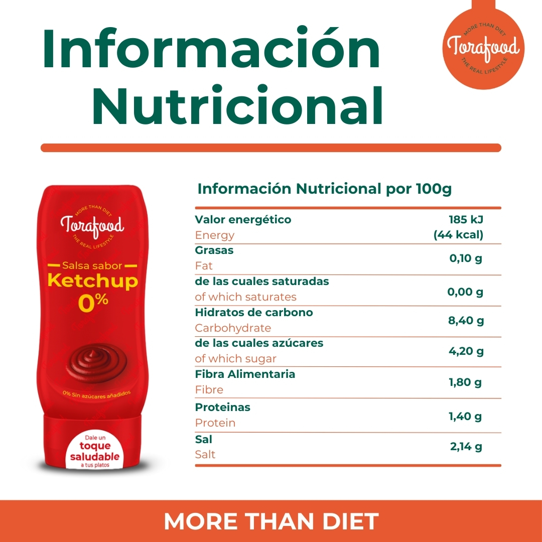 La salsa zero ketchup de Torafood está pensada para quienes quieren disfrutar del sabor tradicional del ketchup sin consumir azúcar añadido. Esta salsa zero ketchup mantiene el equilibrio perfecto entre dulzor y acidez característico del ketchup clásico.