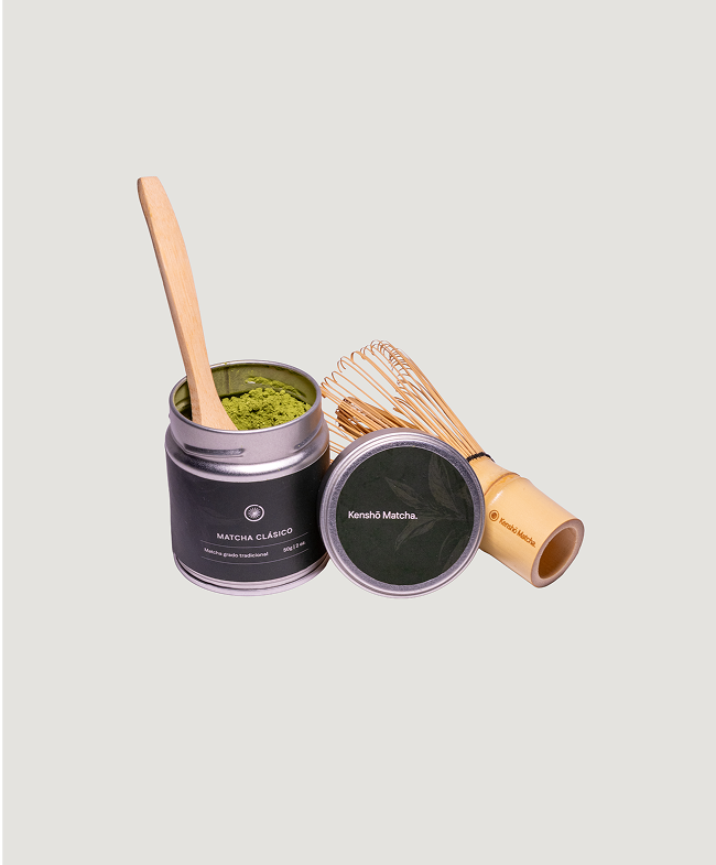 Completa tu rutina diaria con el kit Esencial, tu Té Matcha Kensho, el Chasen (batidor tradicional japonés) y la cuchara, de madera, accesorios de calidad para un producto de calidad.