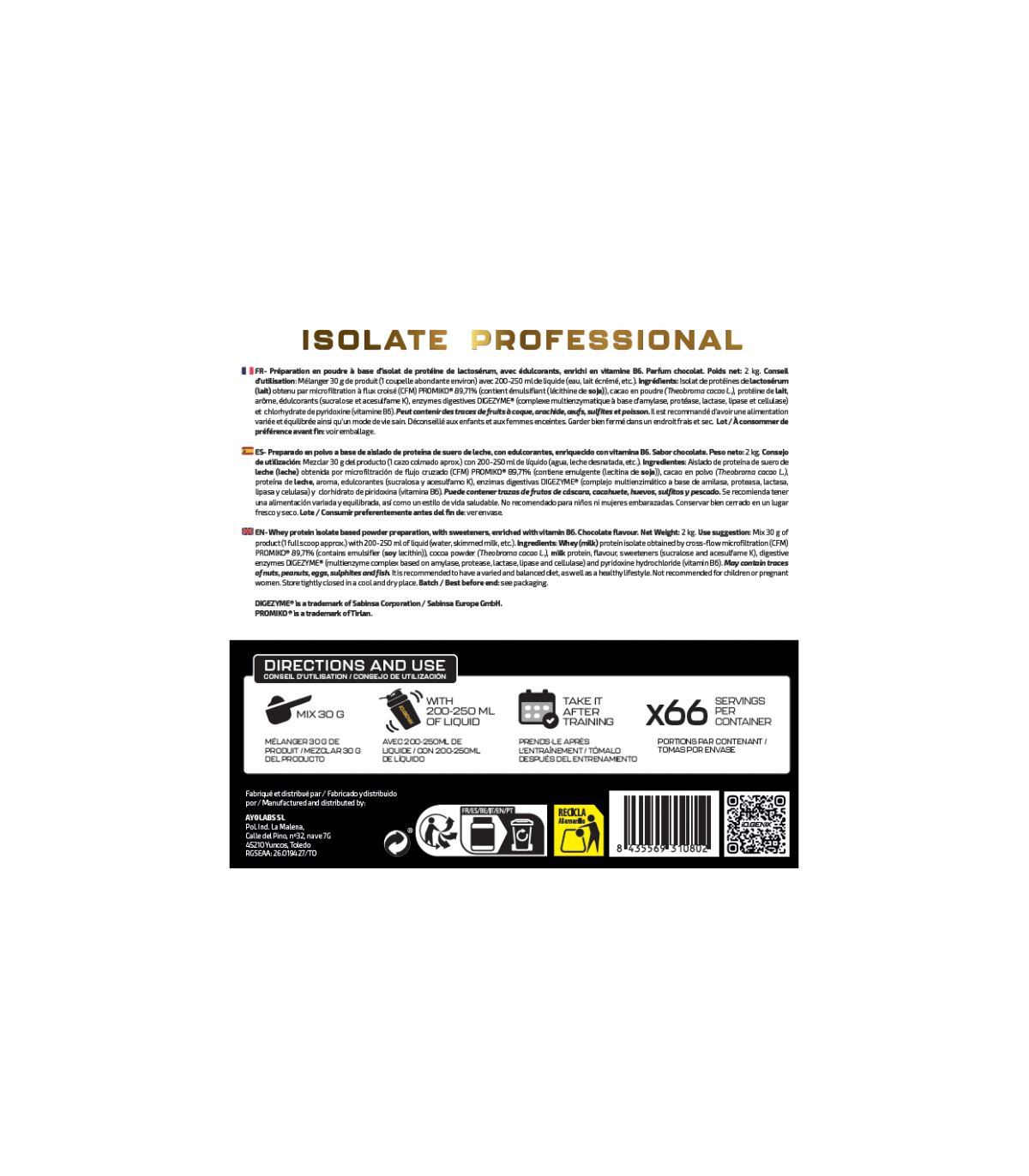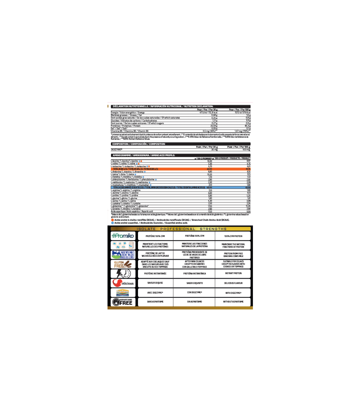 Isolate Professional, se trata de un aislado de proteína que utiliza una materia prima única como es PROMIKO ® por su cantidad de proteína pura total después de haberse extraído por la mejor técnica de la actualidad, microfiltración de flujo cruzado (CFM) preservando la calidad de la proteína y un excelente perfil de aminoácidos. Además, hemos añadido el complejo de enzimas digestivas Digezime® y vitamina B6